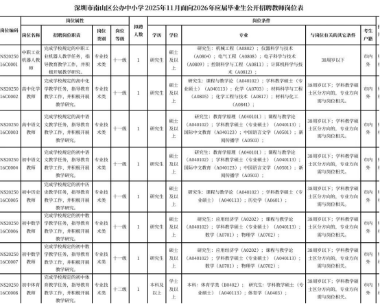 深圳市南山区公办中小学2025-2026学年计划招聘教师300人,本次2025年11月面向2026年应届毕业生公开招聘教师77岗118人,具体岗位详见《深圳市南山区公办中小学2025年11月面向2026年应届毕业生公开招聘教师岗位表》(附件1,以下简称《招聘岗位表》),其余岗位后续另行公告。现就本次招聘有关事项公告如下: