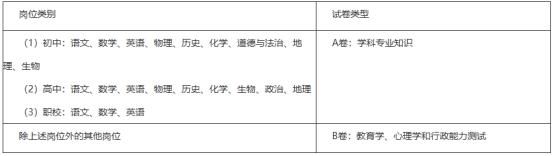 笔试按测试内容分为A、B两种试卷类型。A卷测试内容为学科专业知识,B卷测试内容为教育学、心理学和行政能力测试。具体岗位测试内容见下表: