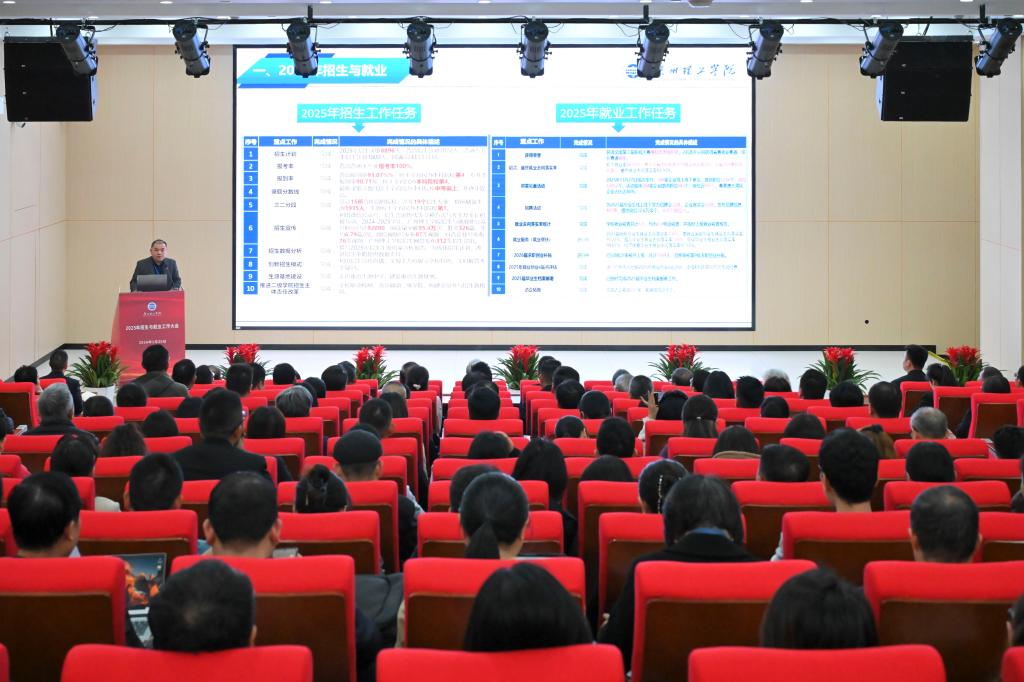 会上,副校长张志红详细汇报了2025年学校招生与就业工作情况。过去一年,学校生源质量稳步提升,录取分数线持续向好,区域影响力进一步扩大,顺利完成了年度招生计划目标。面对复杂严峻的就业形势,学校通过拓宽就业渠道、强化就业指导与服务、搭建高质量就业平台等一系列有力措施,实现了毕业生初次就业率保持高位稳定,就业质量稳步提升,重点领域、重点区域就业人数持续增长。同时,深入分析了招生与就业工作面临的新挑战、新机遇及存在的难点和痛点,强调将进一步加强招生宣传精准度,优化专业结构布局,深化招生工作信息化建设,打造更具吸引力的招生品牌。围绕下一阶段工作,他强调将着力构建“全员参与、全程指导、全方位服务”的大就业工作格局,重点加强校企深度合作、精准帮扶困难群体、提升学生就业核心竞争力,确保毕业生更充分、更高质量就业。
